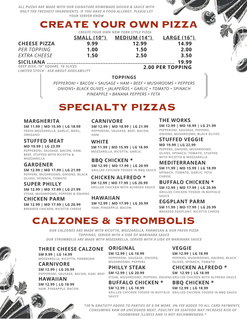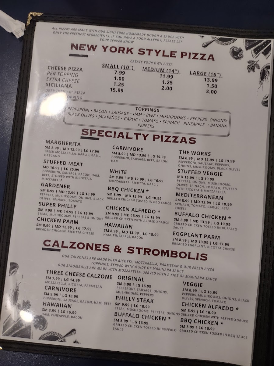 When it comes to pizza, customers can create their own with a Cheese Pizza or opt for the Siciliana. Specialty pizzas like the Margherita, Stuffed Meat, Gardener, and the unique Super Philly or Chicken Parm pizzas bring added excitement to the menu. For those who love stuffed creations, the Three Cheese Calzone, Carnivore Calzone, and Hawaiian Stromboli are must-tries.