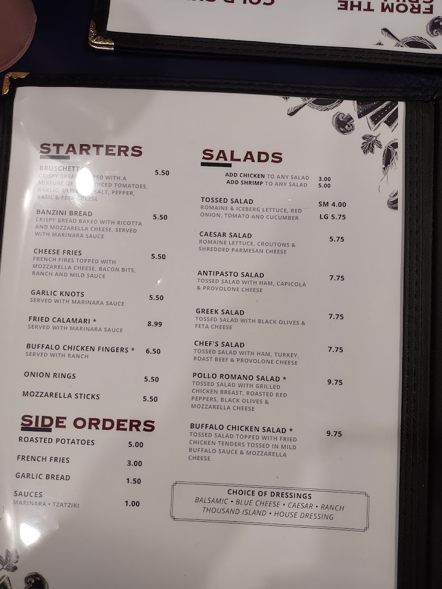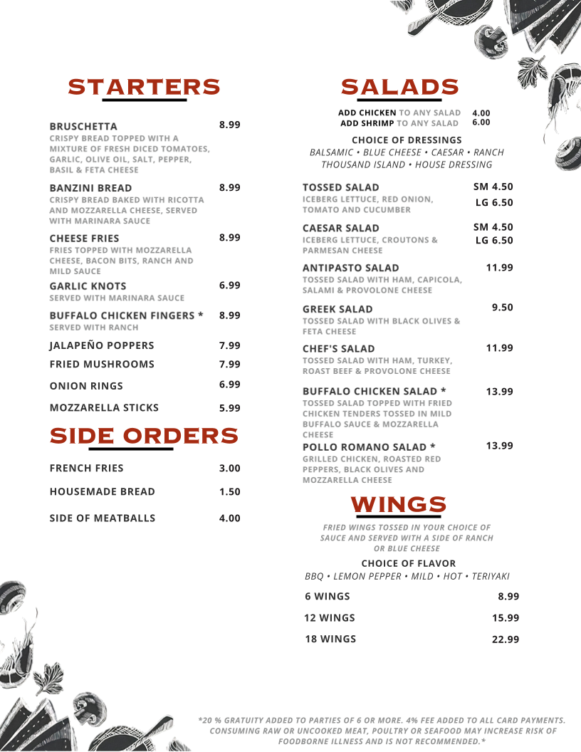 Tulio's Pizzeria & Restaurant offers a diverse and delightful menu that caters to a wide variety of tastes, perfect for both casual meals and special occasions. Starting with the starters, guests can indulge in options like the classic Bruschetta or the savory Banzini Bread, complemented by Cheese Fries and the ever-popular Garlic Knots. For those craving something heartier, Buffalo Chicken Fingers are a great choice. Moving to the salads, there's a refreshing selection, from the crisp Tossed Salad to the creamy Caesar Salad, or the more substantial Antipasto Salad and Greek Salad. For a filling side, guests can enjoy French Fries, Housemade Bread, or a flavorful Side of Meatballs.