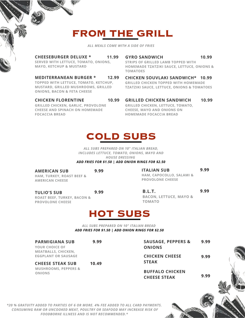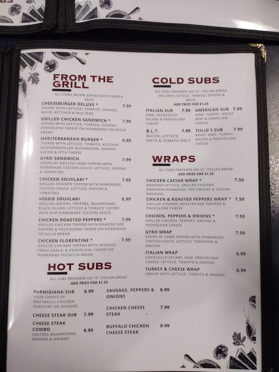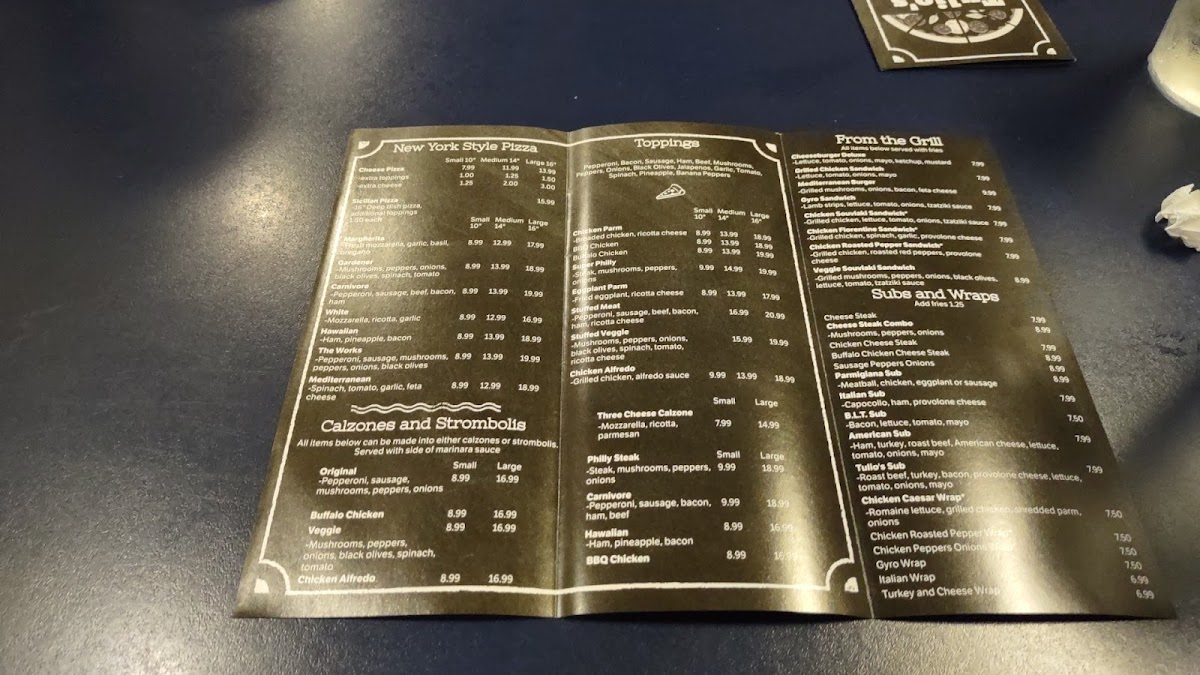 Overall, Tulio's Pizzeria & Restaurant provides an extensive and well-rounded menu that promises something for everyone, whether you're in the mood for a classic pizza, a filling sub, or a comforting dinner entrée. The variety and quality make it a go-to spot for pizza lovers and beyond.