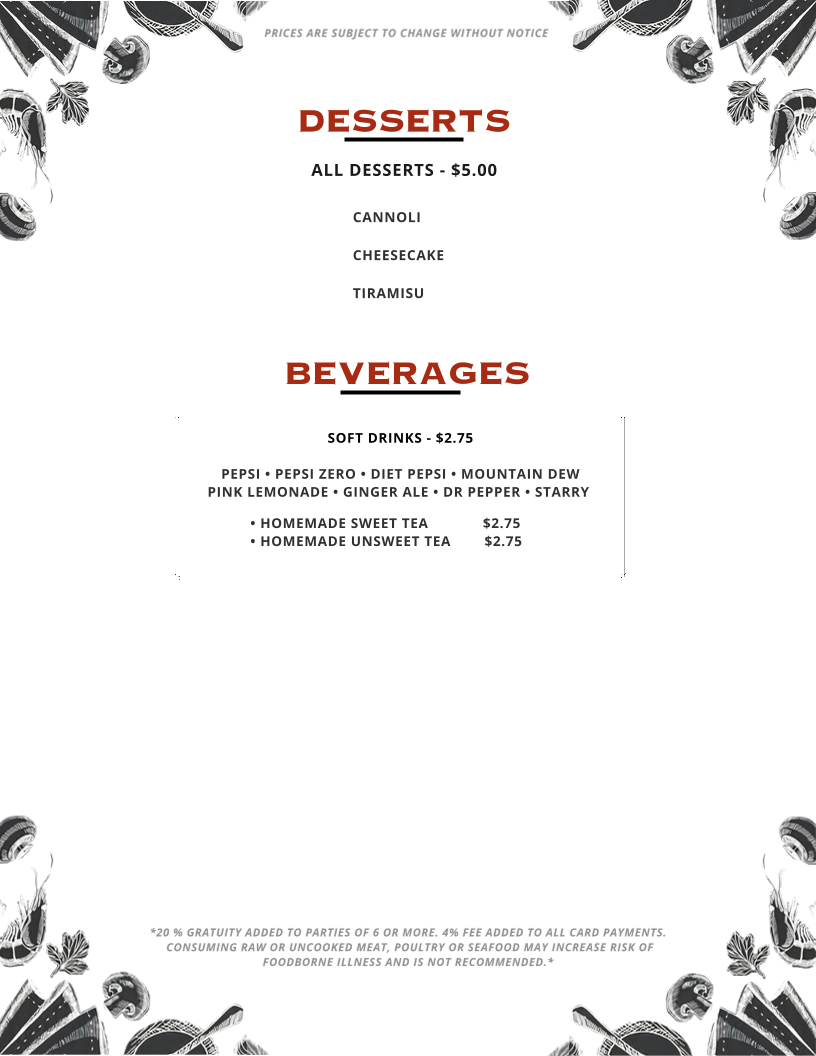 For dessert, treat yourself to the sweet offerings of Cannoli, Cheesecake, or a rich Tiramisu. And to quench your thirst, enjoy a selection of beverages such as Pepsi, Pepsi Zero, Diet Pepsi, Mountain Dew, or refreshing Pink Lemonade.