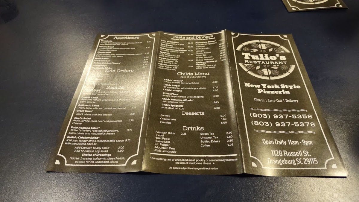 In the dinner entrees section, there’s something for everyone, including comforting dishes like Penne Ala Vodka, Spaghetti, and Fettuccine Alfredo. Tulio's Ravioli and Shrimp Scampi add a touch of elegance to the meal. The children's menu offers simpler choices like Chicken Tenders, Butter Noodles, and a One-Topping Pizza, ensuring that even the youngest diners have plenty of delicious options.